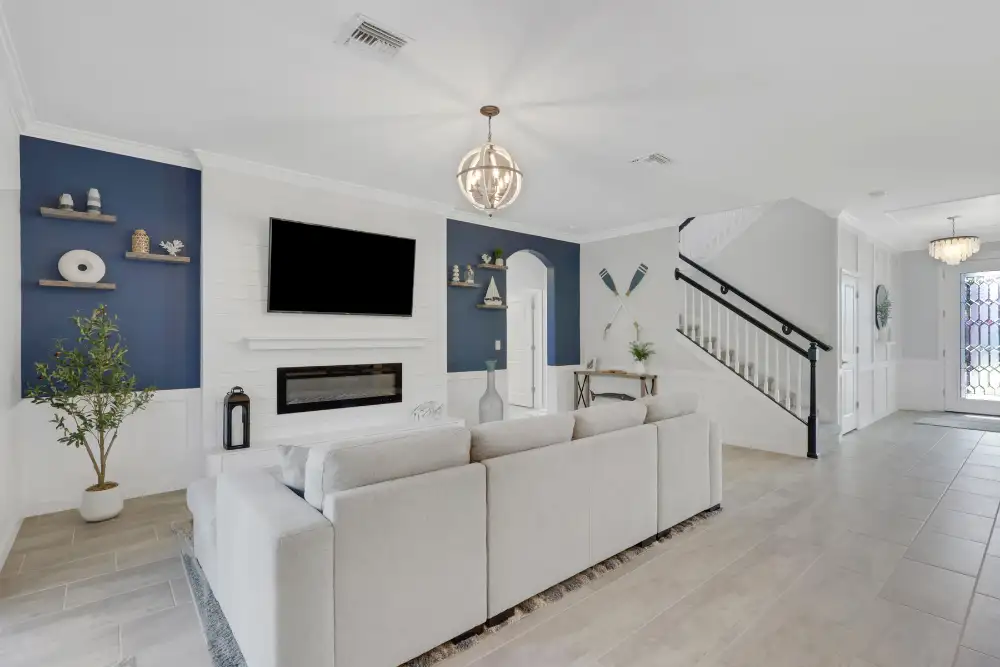 Step into the family room and you'll see even more of their work. It is hard to tell from this photo but you can see a larger and closer view here. The wall has a custom built shiplap accent wall with a fireplace built in, wall mounted TV, mantle and custom shelving. Plus, there's the beautiful blue accent walls tying everything together. You'll also see in person that there is a board and batten accent wall under the staircase.