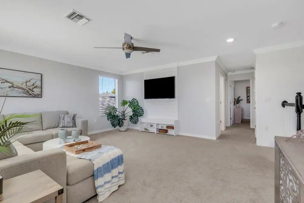 One of the many great features of this home is that there is not only a den that we saw earlier but this extremely spacious loft upstairs. The current owners have it set up as a media room but I've seen it as a playroom for kids or as an office. Typically, people that want a formal dining room will make the downstairs den the dining room and their office upstairs in the loft. It's a great flex space that you can do what you'd like with it! And, notice the woodwork here too with the crown molding and accent wall behind the TV.
