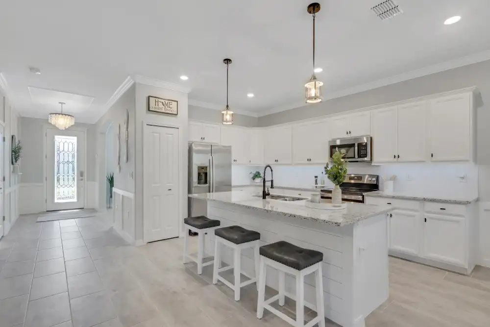 Spinning 180 degrees puts you in the gorgeous kitchen. Beautiful white cabinetry looks incredible against the perfectly matched granite counters. The island serves as a great place to eat and has the same shiplap accent as the living room wall and I love the pendant lighting that they chose. There is under-cabinet lighting added as well.