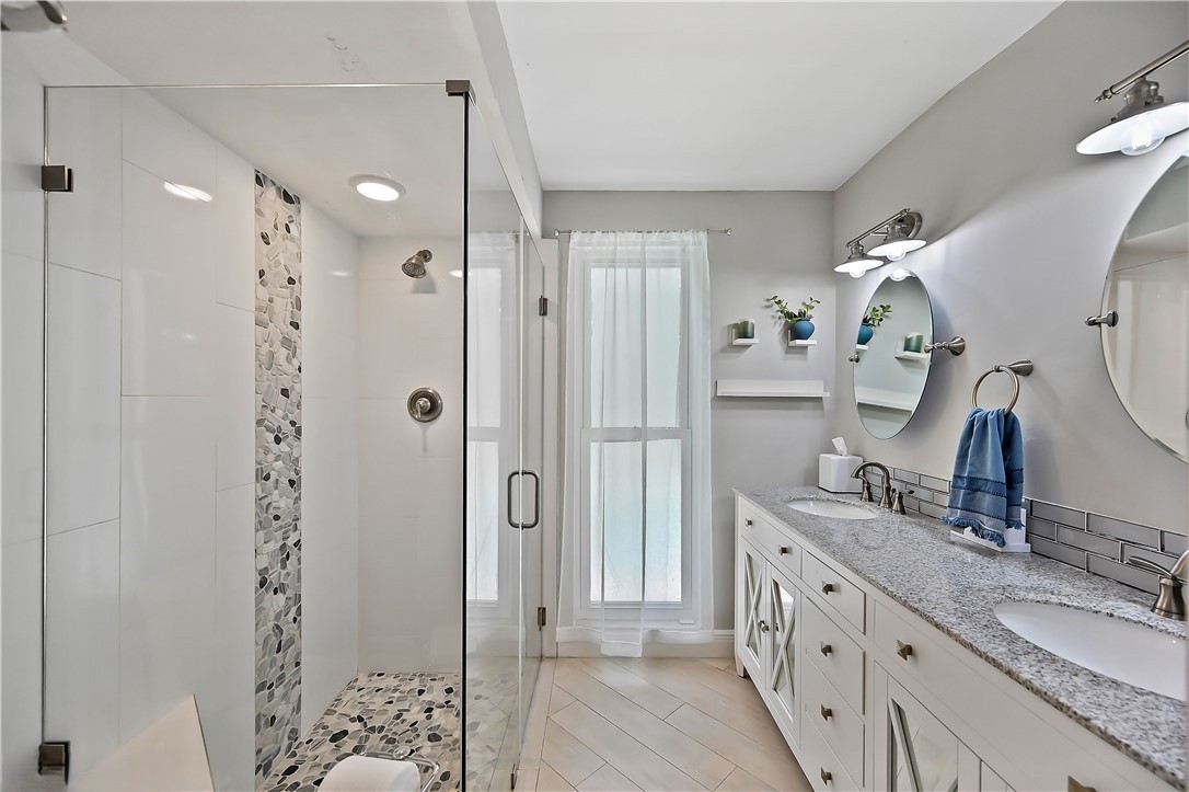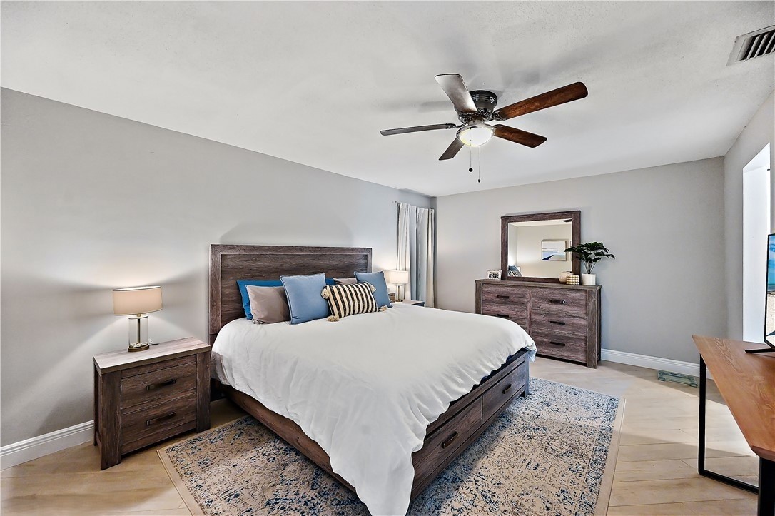 One of the features of this home that I like a lot is that all three bedrooms will accommodate a kind-sized bed. The master, pictured above, has a really great bathroom with a glass-enclosed shower and dual vanity. Plus, there is a door leading right to the splash pool and back yard.