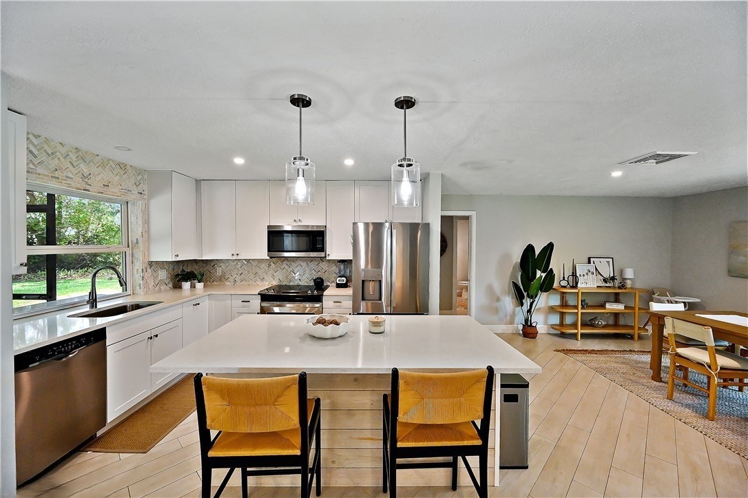 The home is fully remodeled and the owners made some great choices along the way. The second you open the front door, you see the wide open layout with kitchen, family room and dining room all together which makes having friends and family over for dinner really nice. The other great feature of this layout is that it has split bedrooms meaning the master is on one side of the home and the two guest bedrooms are on the other. Plus, there is a pocket door allowing you to completely separate the guest bedrooms from the rest of the home!