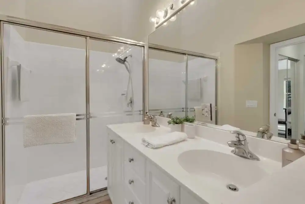 The master bedroom has a lot of natural light from the large windows that look out to a private reserve. There is plenty of closet space and the bathroom has dual vanities and a glass-enclosed shower.