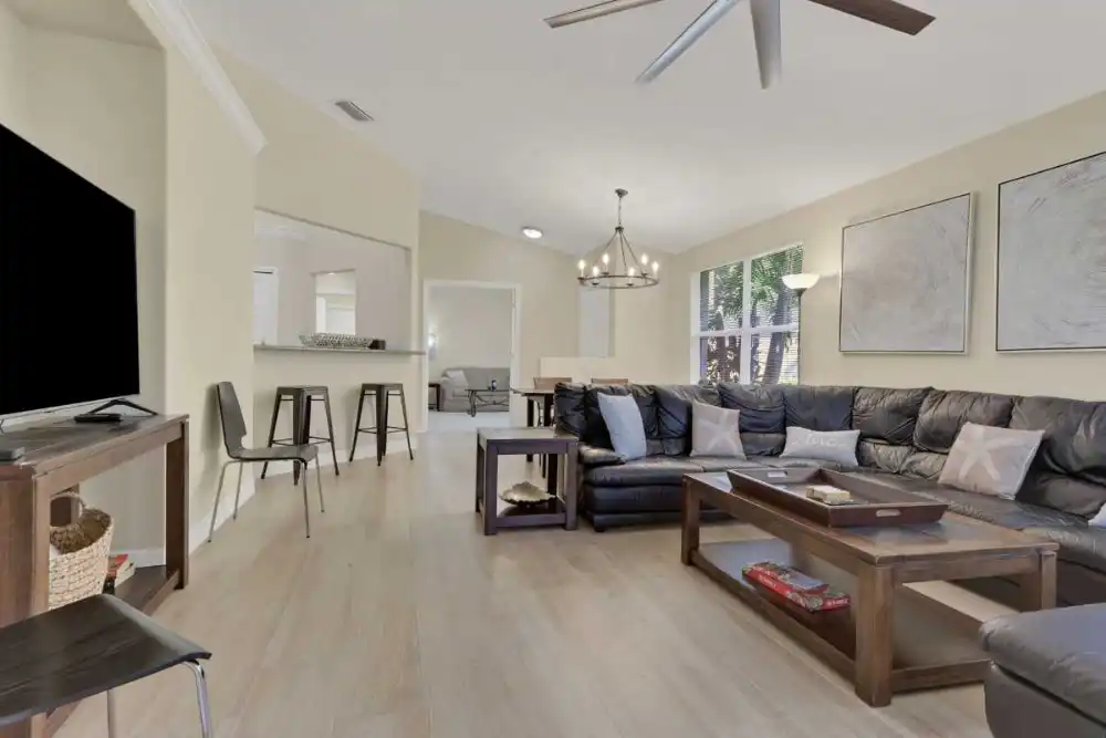 One of the first things I noticed when I walked in was that this isn't your usual, boring layout. The layout is very unique and has split bedrooms for privacy. There's a great dining area (pictured above) and a cozy family room that overlooks the screened lanai.